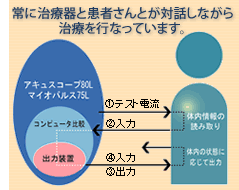 最初に2本の導子から生体内に電流を送り、多様な病的生体機能、炎症、興奮状態を異常信号(異常波)として2本の導子で受け取ります。生体組織内の電気的特性をデジタル特性に分析・解析することにより、その変化に応じて、出入力信号(波長)を変化させ、組織や生体を治療します。